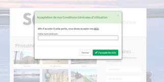 Une fenêtre pop-up s'ouvre (en haut de page), vous devez prendre connaissance des Conditions Générales d'Utilisation et les accepter en ajoutant vos Nom et Prénom.